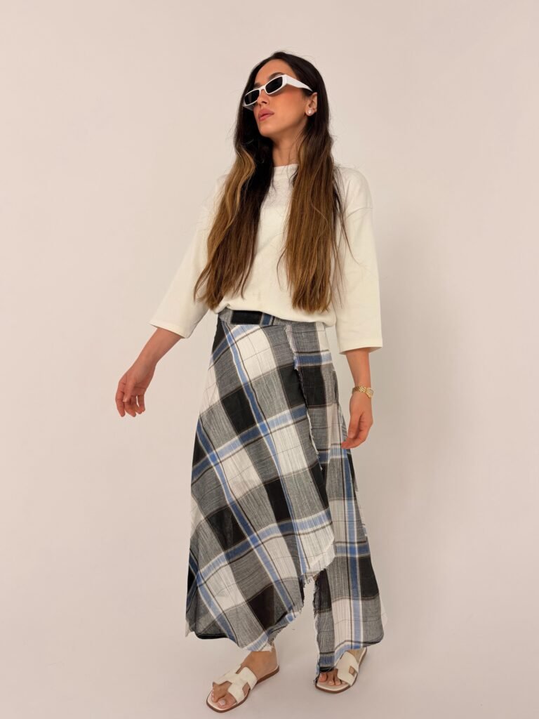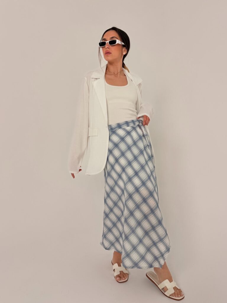 חצאית משבצות שסע תכלת