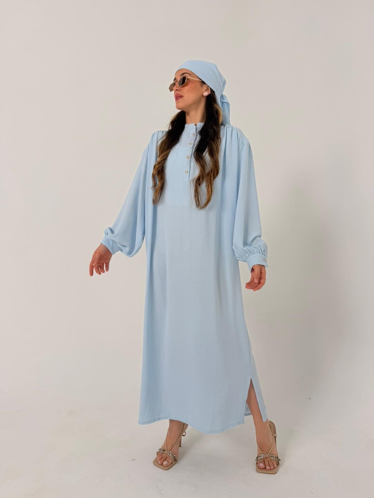 מגיעה עם כיסוי ראש תואם מבד זהה, הניתן לקשירה במגוון סגנונות ליצירת מראה ייחודי ומוקפד.
