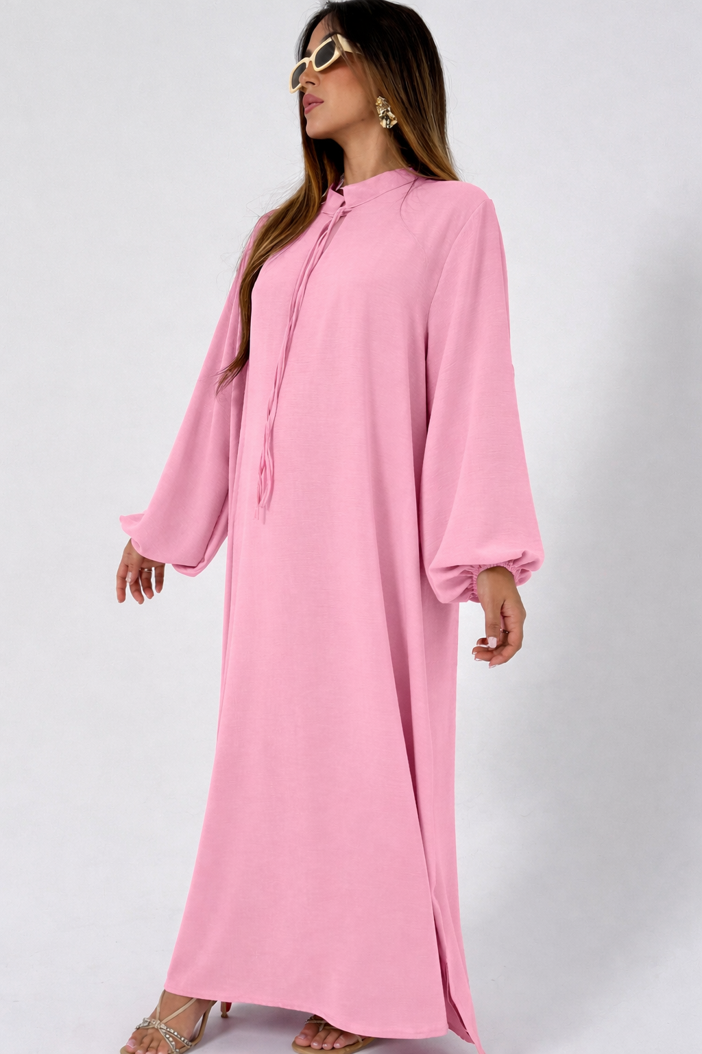 הדגם כולל שרוולים ארוכים ונפוחים עם כיווץ עדין בקצה, מפתח צוואר מעוגל עם קשירה עדינה בחזית שמוסיפה טאץ’ רך ונשי, ושסע צדדי שמעניק תנועה וקלילות בהליכה.