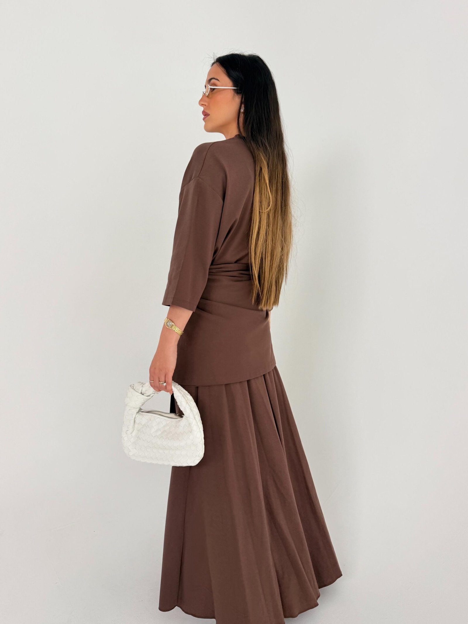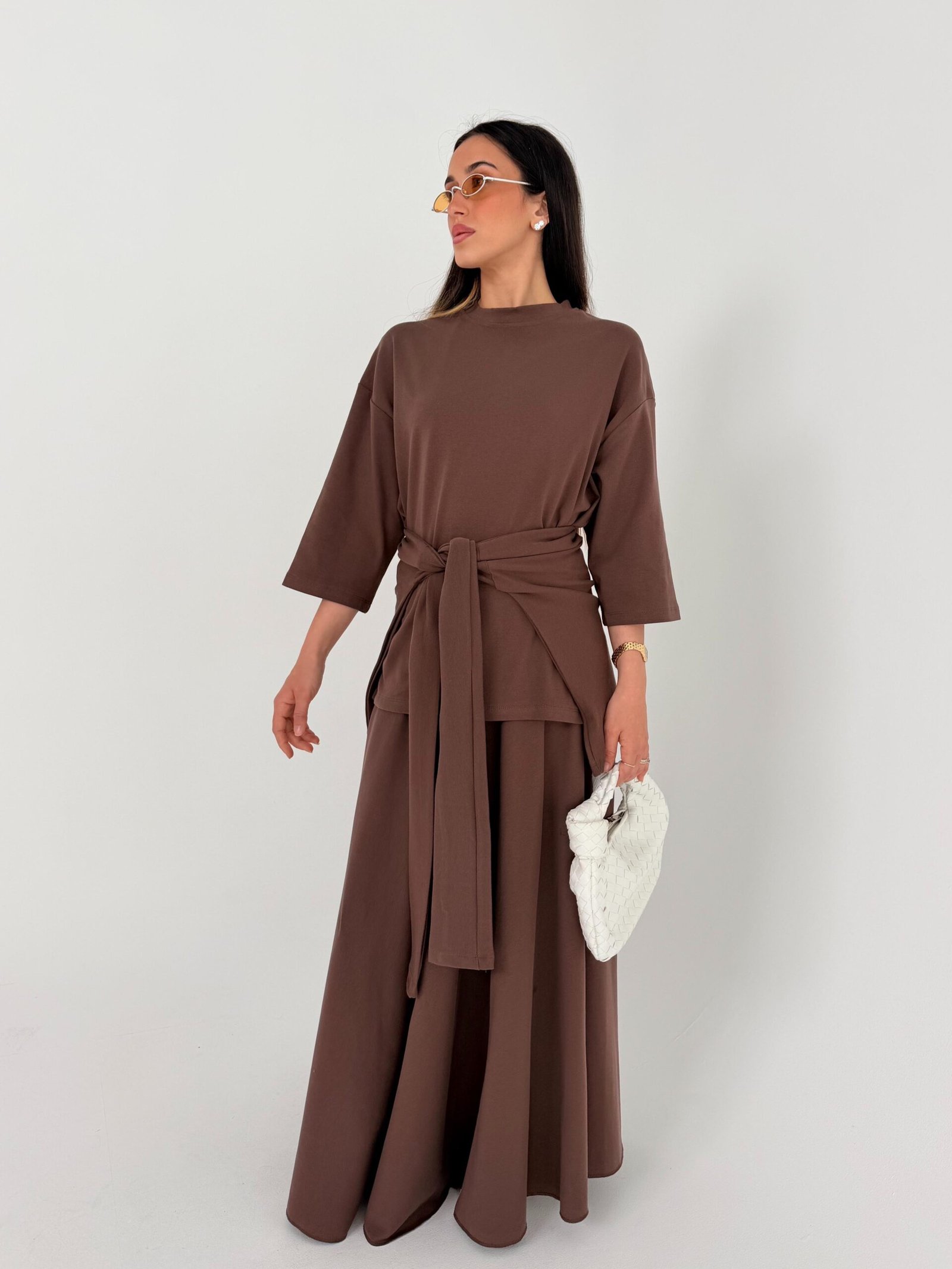 חליפה בגזרה נשית ונשפכת, הכוללת 3 חלקים – חלק עליון עם שרוולים קצרים, חצאית מתרחבת באורך מלא וחגורת קשירה.