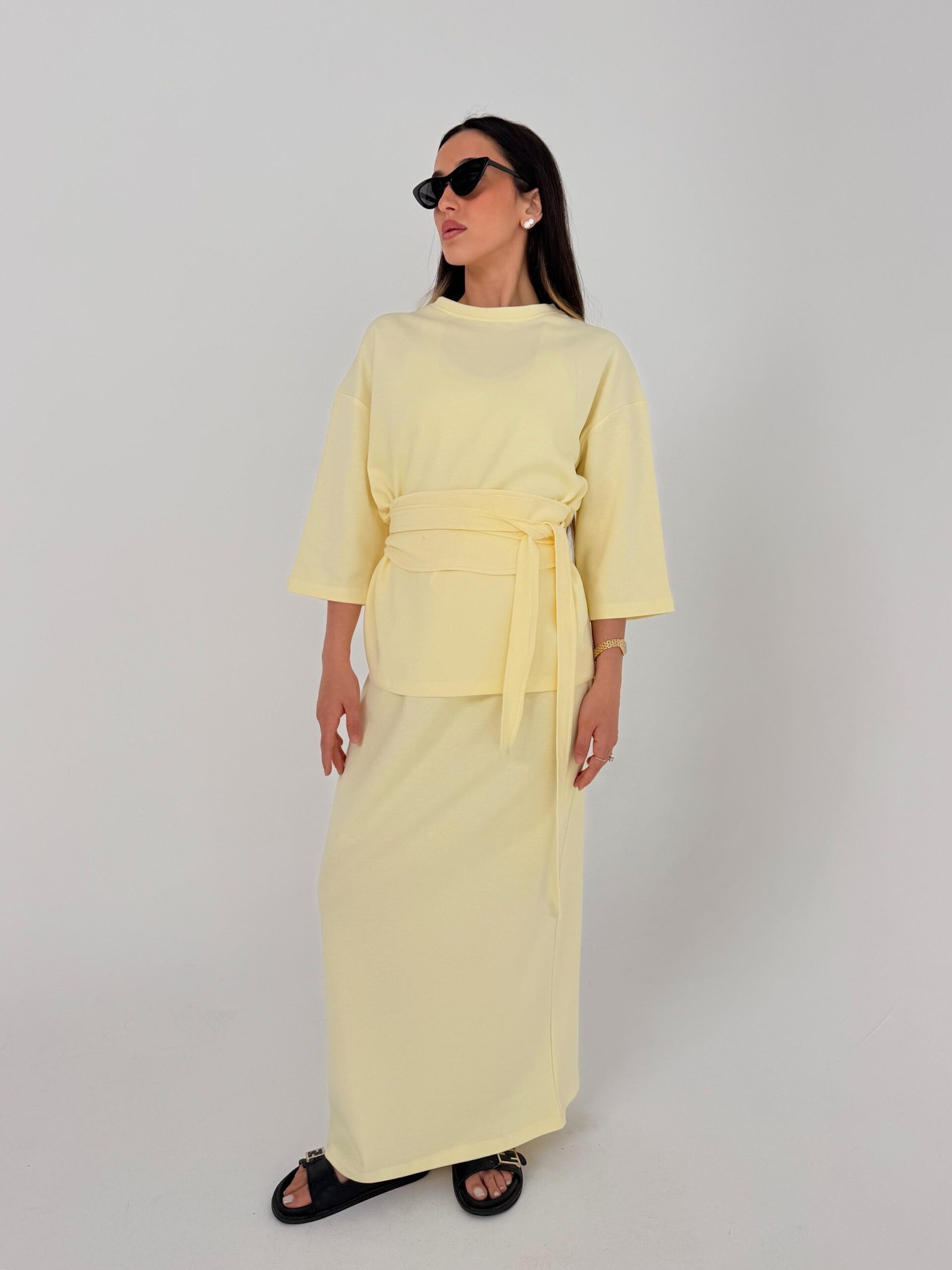 סט הכולל חולצה בגזרה נינוחה, חצאית באורך מלא וחגורת קשירה להדגשת המותן.
