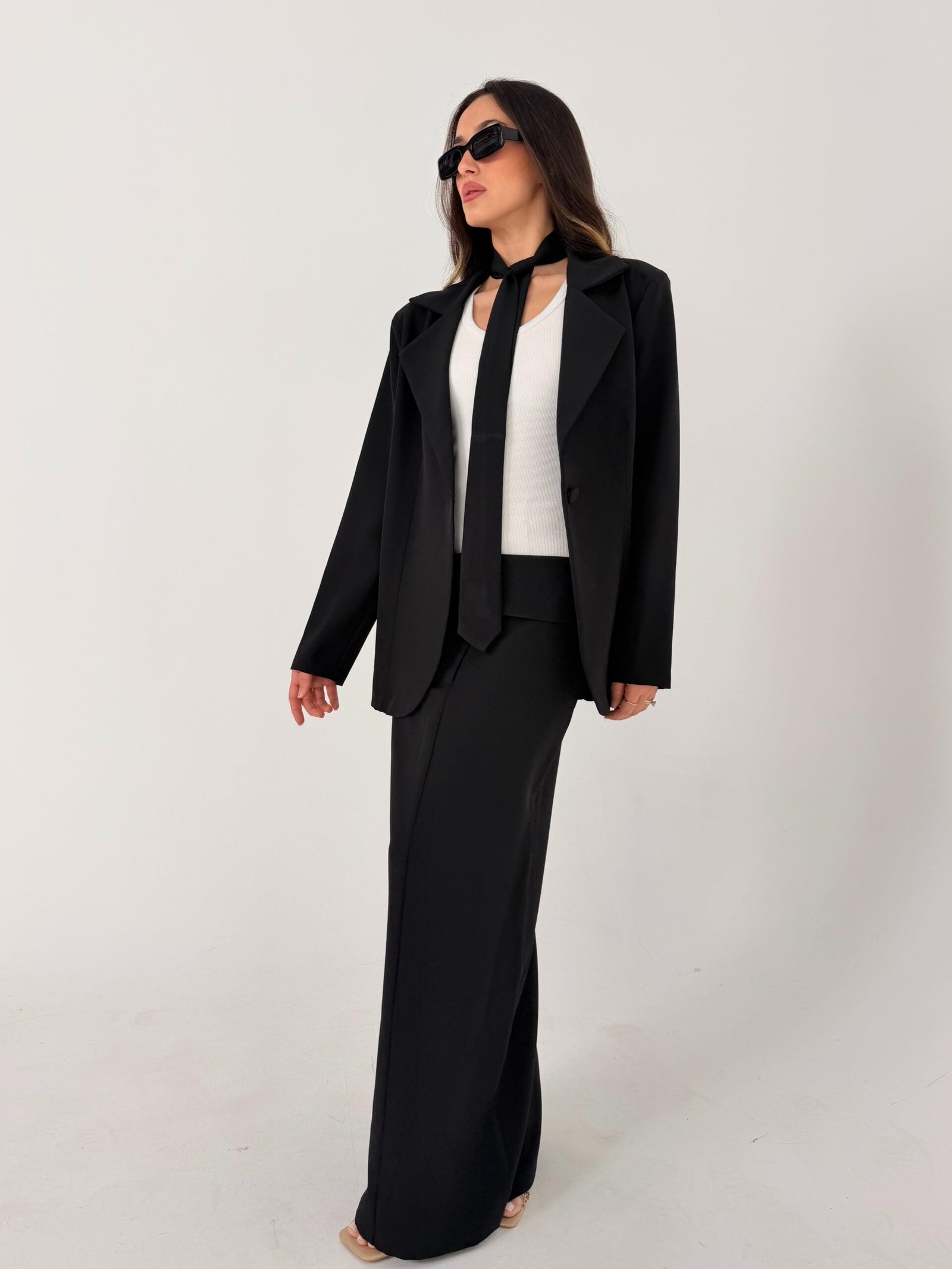 חליפה מחויטת אלגנטית הכוללת ז׳קט בגזרה ישרה עם דש רחב וחצאית מקסי ארוכה בקו נקי ומחמיא. מראה קלאסי ומינימליסטי עם נוכחות אופנתית.