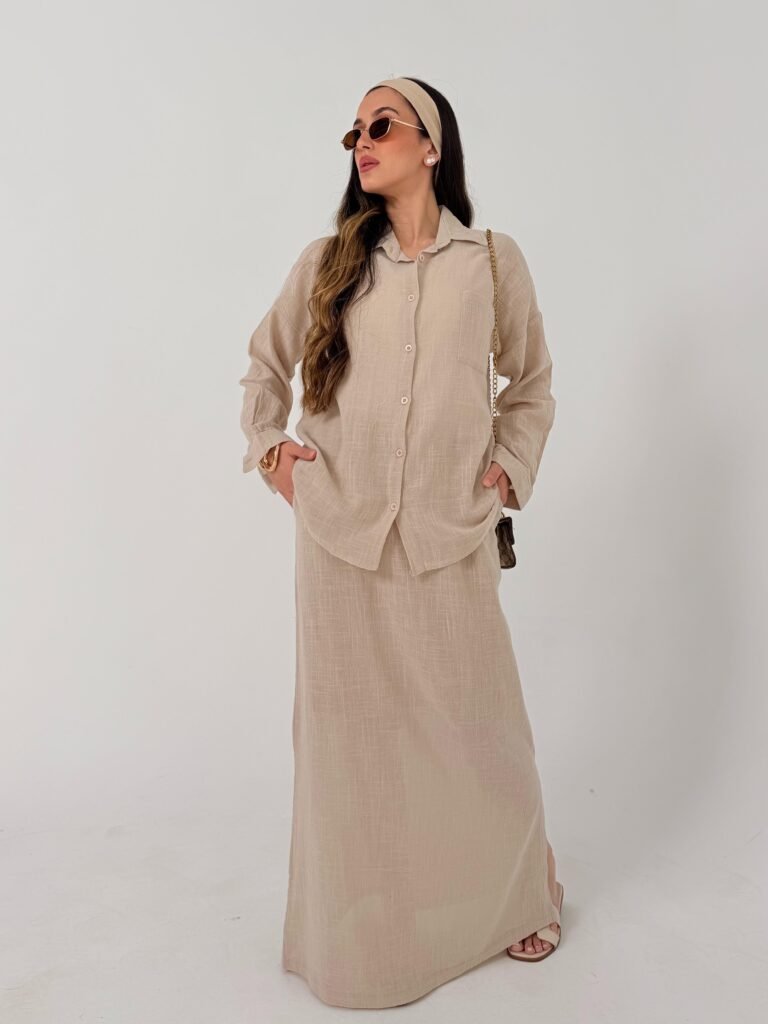 כוללת חולצה מכופתרת בגזרה משוחררת וחצאית מקסי עם קשירה במותן לנוחות מושלמת ולמראה קז׳ואל-אלגנטי.