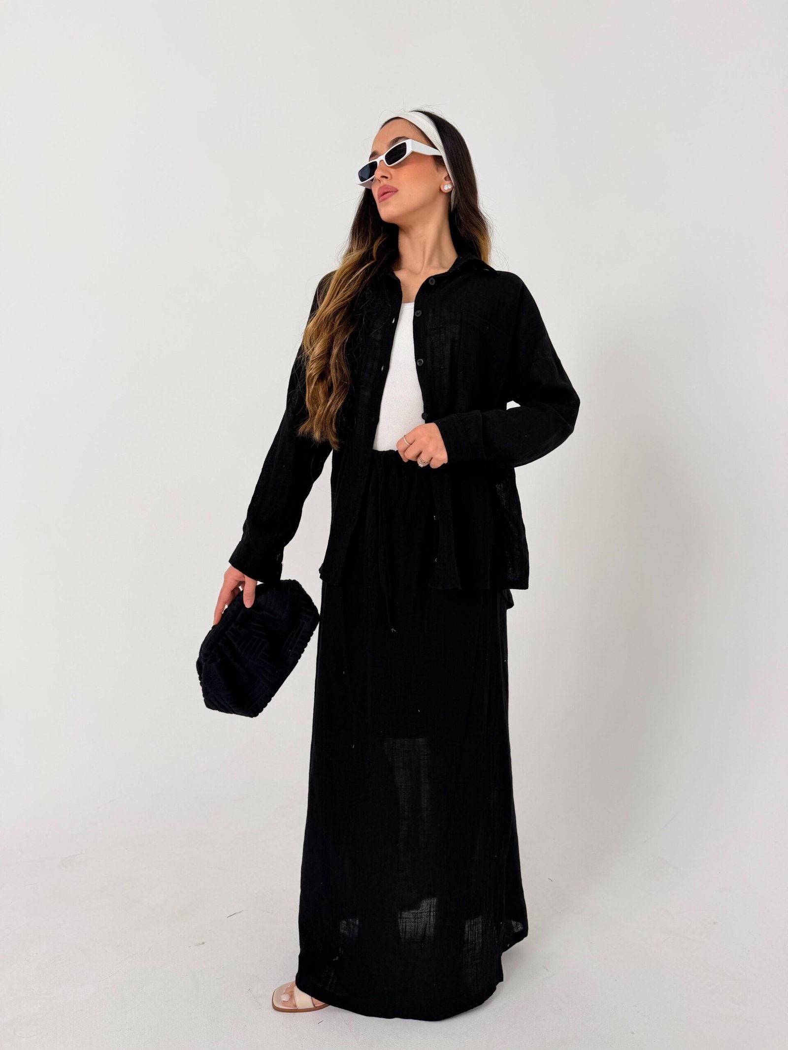 כוללת חולצה מכופתרת בגזרה משוחררת וחצאית מקסי עם קשירה במותן לנוחות מושלמת ולמראה קז׳ואל-אלגנטי.