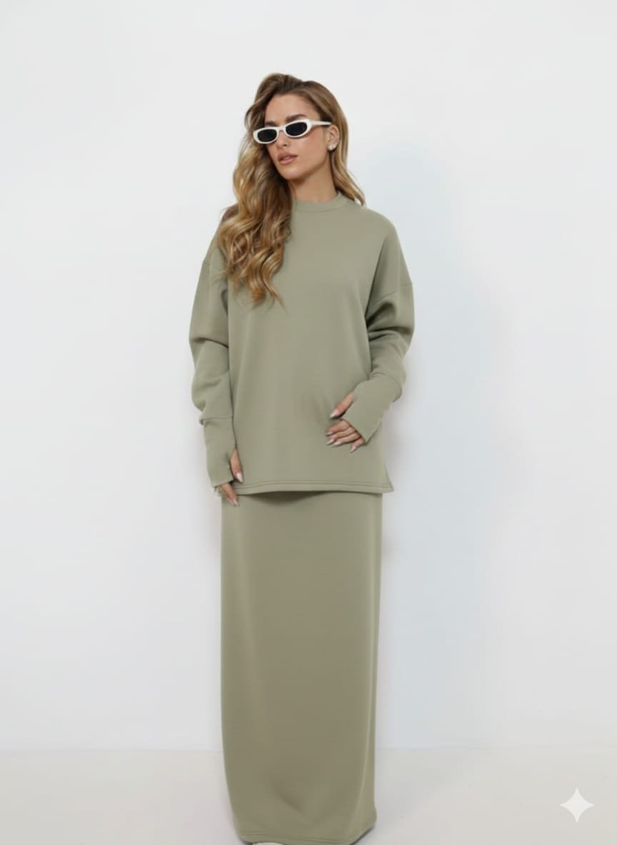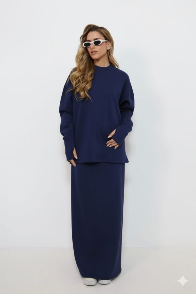 חליפת פוטר שחורה בגזרה רפויה ואלגנטית, עם סווטשירט אוברסייז ושרוולים ארוכים בשילוב חצאית מקסי חלקה, ליצירת מראה מינימליסטי ונוח עם סטייל אורבני