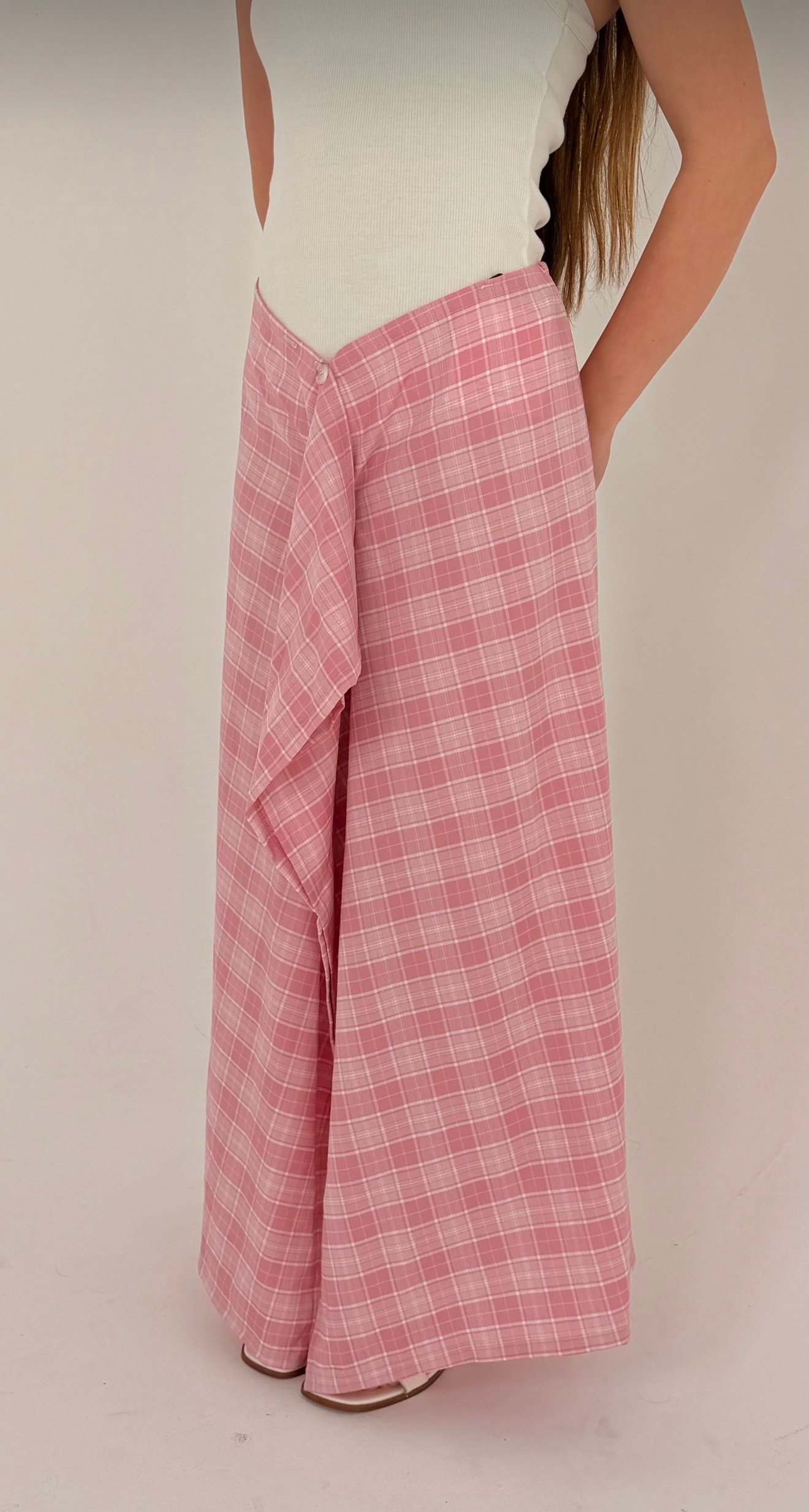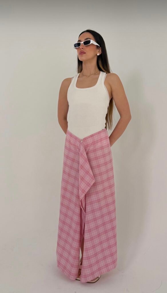 חצאית באורך מלא בגזרת מעטפת עם סגירה קדמית המדגישה קפל נשפך.