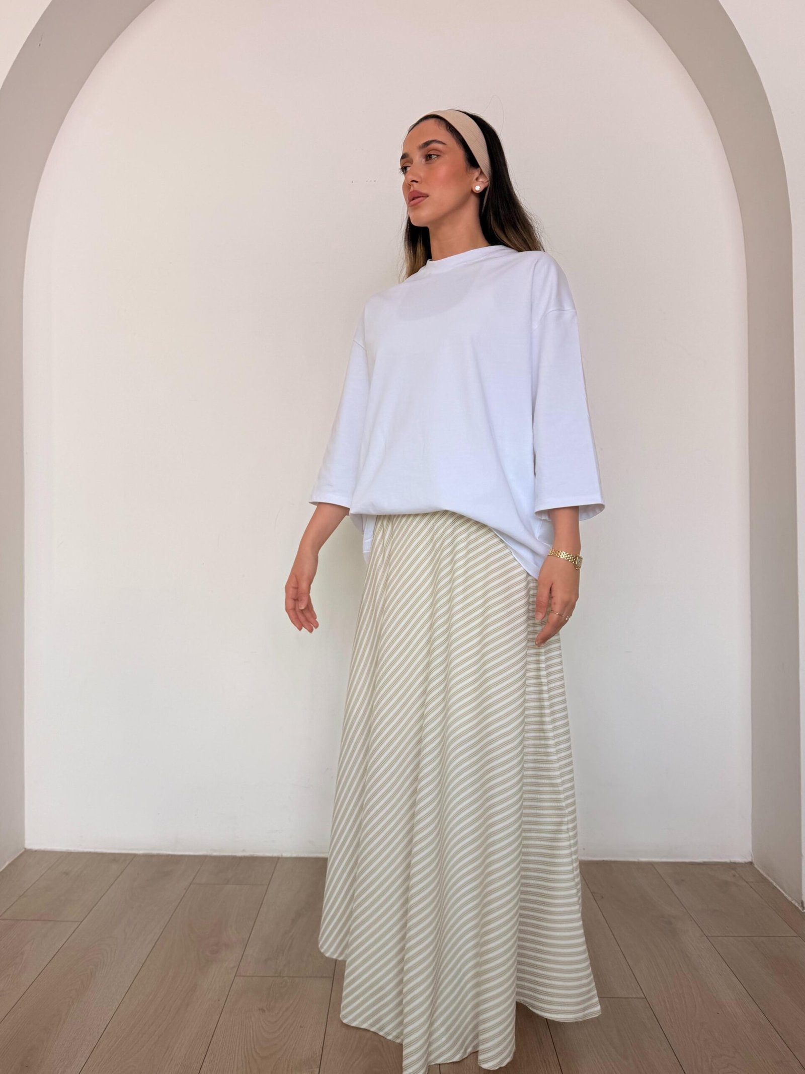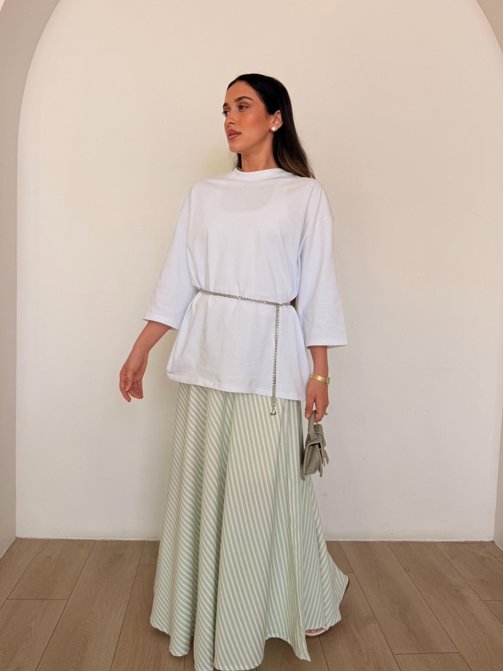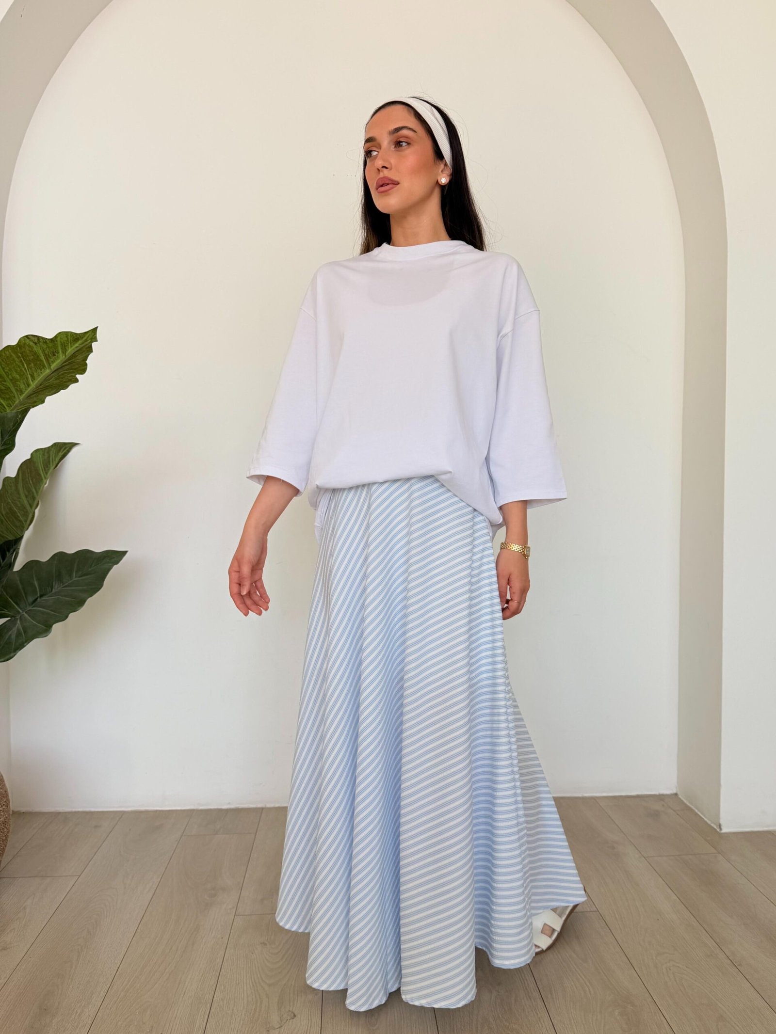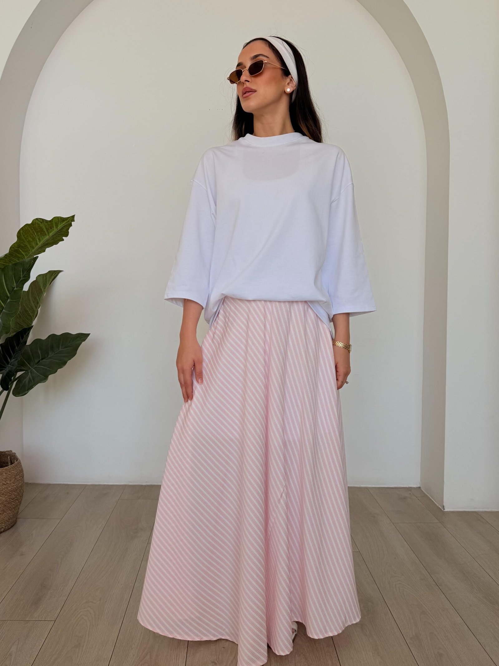 חצאית מקסי בגזרה מתרחבת ונשפכת עם דוגמת פסים אלכסוניים עדינה. הגזרה הגבוהה והקלילה יוצרת תנועה יפה בכל צעד ומעניקה מראה נשי, אוורירי ומלא סטייל. מושלמת לשילוב עם חולצה חלקה ללוק יומי מוקפד או אלגנטי.