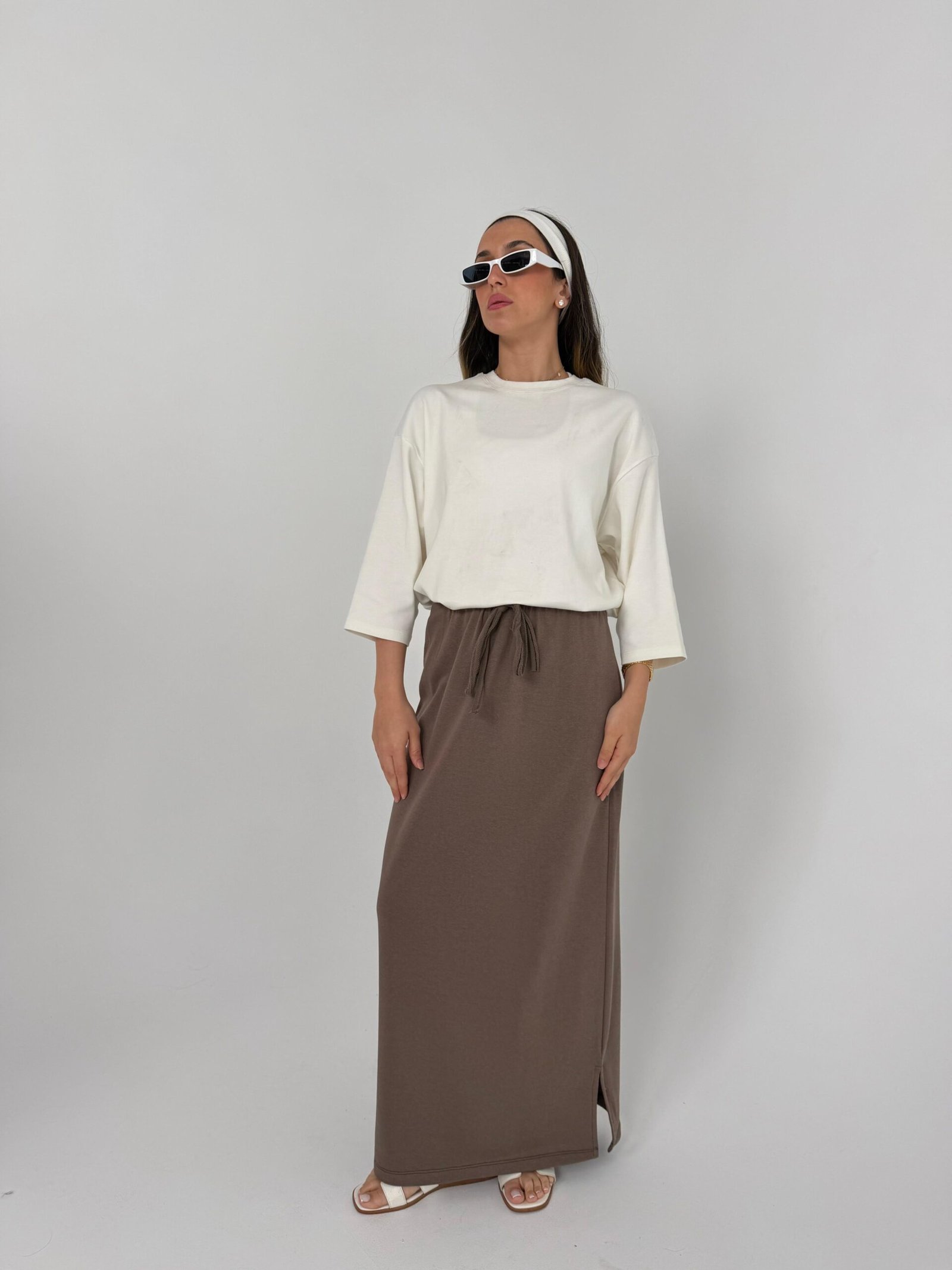 חצאית ארוכה בגזרה ישרה עם גומי ושרוך במותן למראה נקי, נוח ואלגנטי. מתאימה לשילוב עם פריטים בסיסיים ללוק יומיומי מוקפד